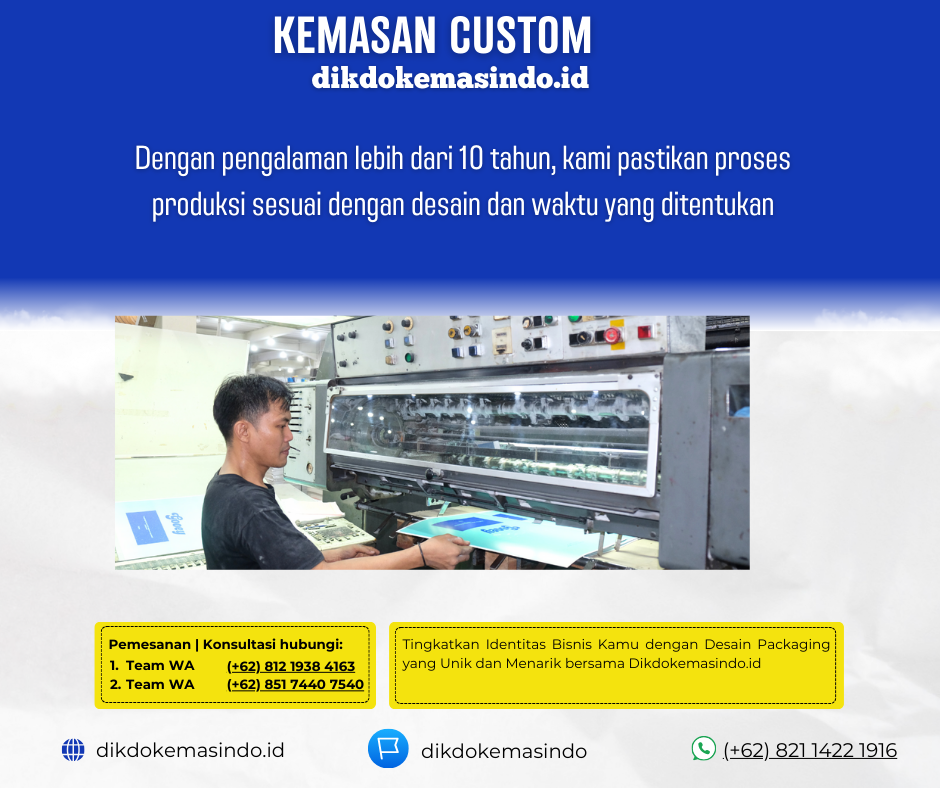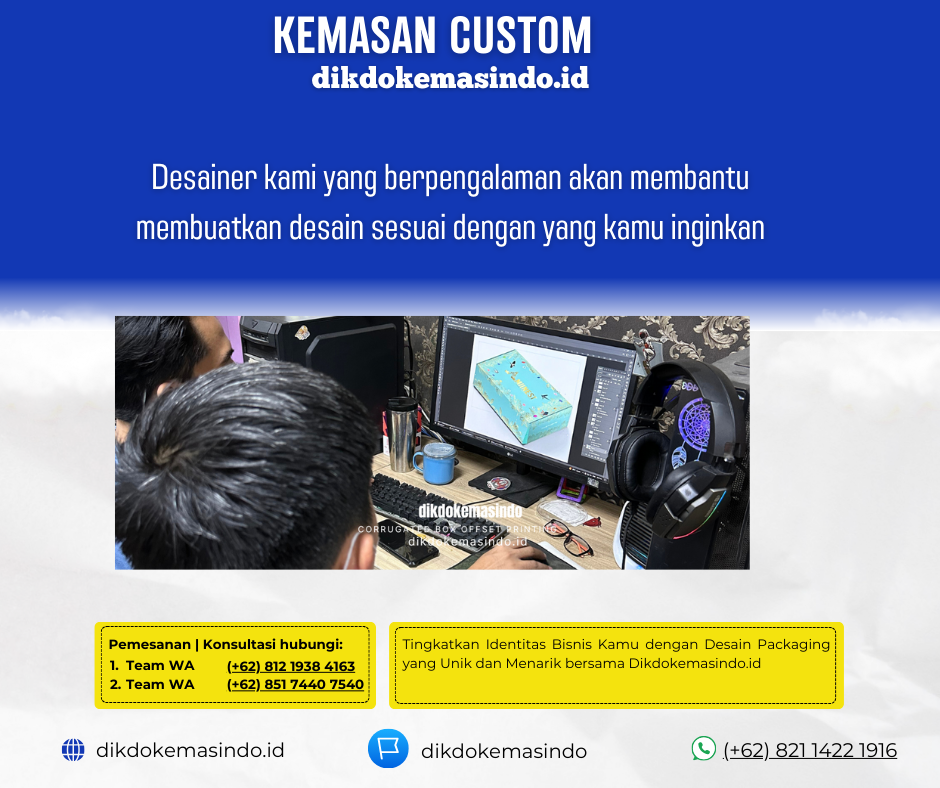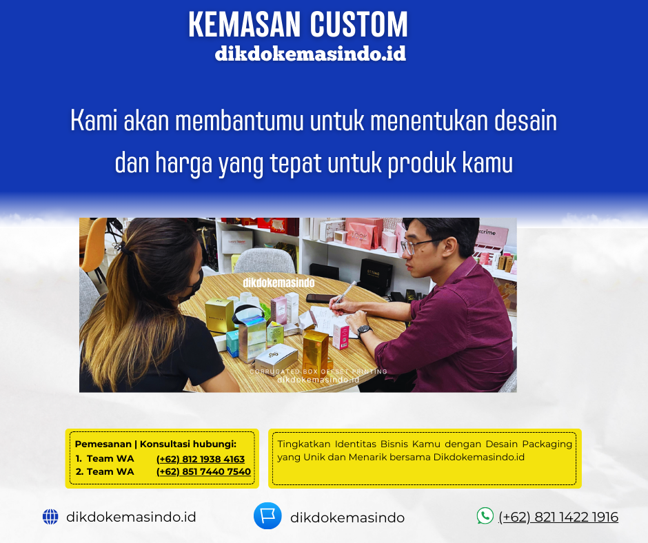 Untuk pemesanan box,Hampers custom silahkan hubungi tim marketing Dikdokemasindo.id dan informasikan ukuran dan desain yang anda inginkan melalui tombol Whatsapp di halaman ini. Atau anda bisa kunjungi kami di tokopedia dan shopee